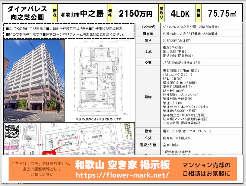 住所 〒641-0014 和歌山県和歌山市毛見1505−11 交通 築年月 2000年6月 総戸数 建物構造 鉄骨鉄筋コ…